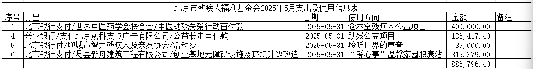 北京市残疾人福利基金会2025年5月支出及使用信息表