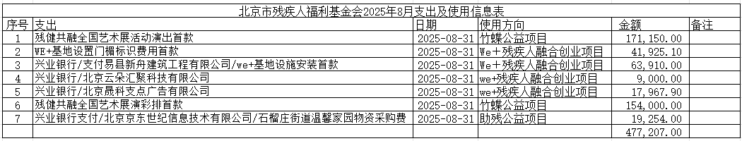 北京市残疾人福利基金会2025年8月支出及使用信息表