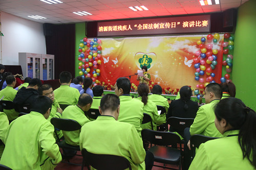 无障碍声明 无障碍操作说明 网站地图 开启无障碍辅助工具 官方微信 官方微博 首页 欢迎访问北京市残疾人联合会网站 政务信息 政务公开 通知公告 党建工作 政策法规 人事工作 联系信息 资讯信息 工作动态 各区动态 协会动态 中国残联 专题专栏 视频报道 《挚友》杂志 相关知识 业务频道 康复服务 教育就业 文化体育 法律维权 辅助器具 爱心助残 服务平台 残疾人证 生活保障 康复服务 辅助器具 教育培训 劳动就业 交通出行 互动交流 热点问答 领导信箱 在线咨询 在线调查 站内搜索 搜索 所在位置 首页 > 资讯信息 > 各区动态 > 大兴 大兴区清源街道温馨家园举办“全国法制日”演讲比赛 文章来源:大兴区残联 作者:清源街道残联 发表时间:2015-12-10 【字体:大 中 小 】 图为比赛现场 12月9日,清源街道温馨家园举办了“全国法治日”演讲比赛。比赛以演讲的内容和感情,为主要的评选标准。残疾朋友们将自己对法律的理解,传递给在场的每一个人,房间内弥漫着神圣、庄严的气氛。 此次演讲比赛的开展,一方面是迎接“全国法治日”的来临,向残疾朋友宣传法律的重要性;另一方面是通过演讲比赛的形式,提升残疾朋友的自信心,同时增加对法律的了解,以帮助残疾朋友更好地懂法、守法、用法。 分享到: